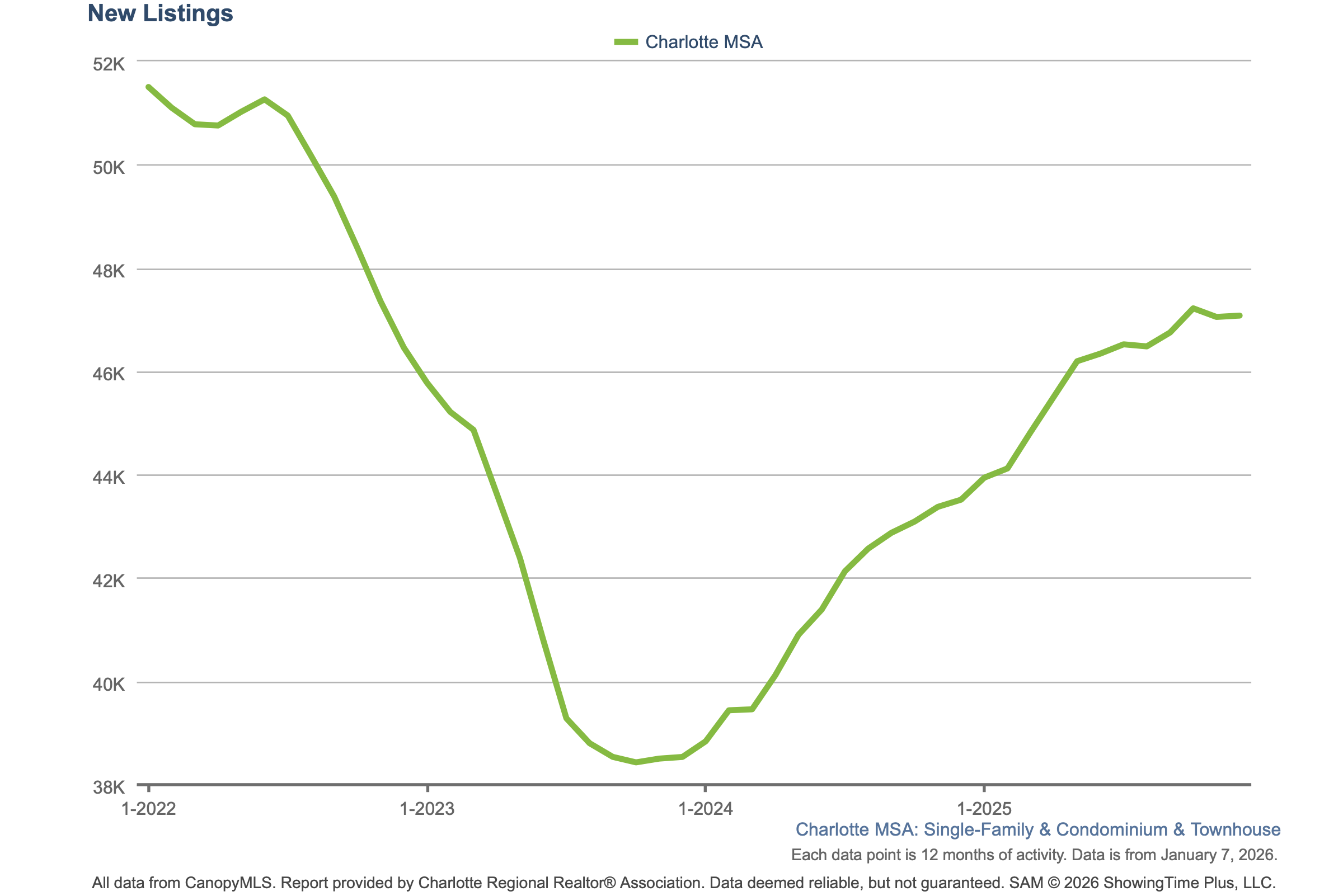 New listings in the Charlotte area tell a story of gradual recovery and renewed momentum. After peaking in early 2022 and then steadily declining through late 2023, listing activity began to stabilize and turn upward throughout 2024. That upward trend carried into 2025, with rolling 12-month new listings climbing consistently and ending the year just above 47,000. This rebound suggests that more homeowners are finding the confidence and motivation to bring properties to market, helping restore balance after a prolonged period of tight supply.