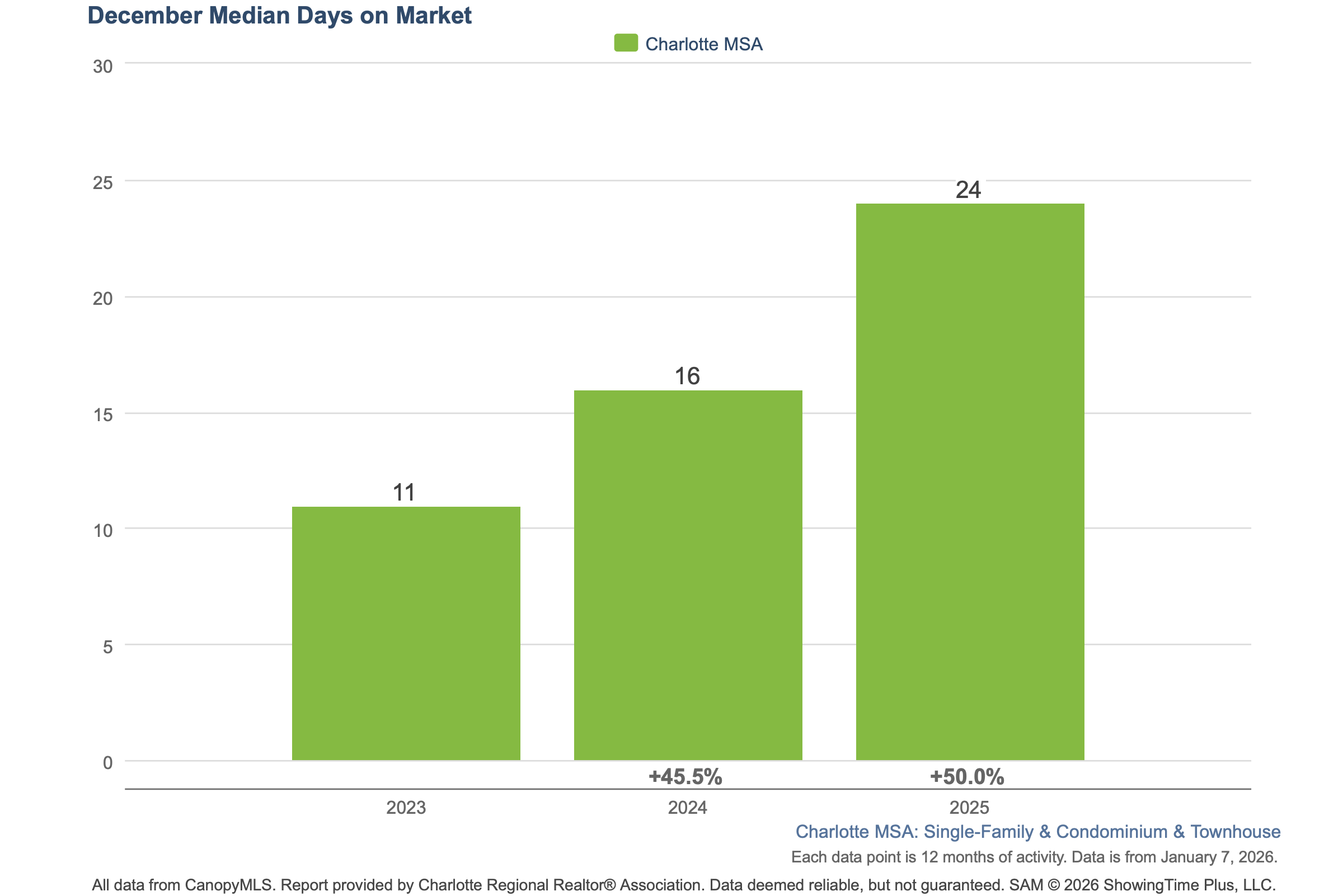 Median days on market in the Charlotte area have steadily increased over the past two years, signaling a clear shift toward a more normalized and sustainable pace of activity. Rolling 12-month figures show homes spending a median of 11 days on the market in December 2023, rising to 16 days by December 2024, and reaching 24 days by December 2025. This progression reflects a market that has moved away from the ultra-fast conditions of earlier years.