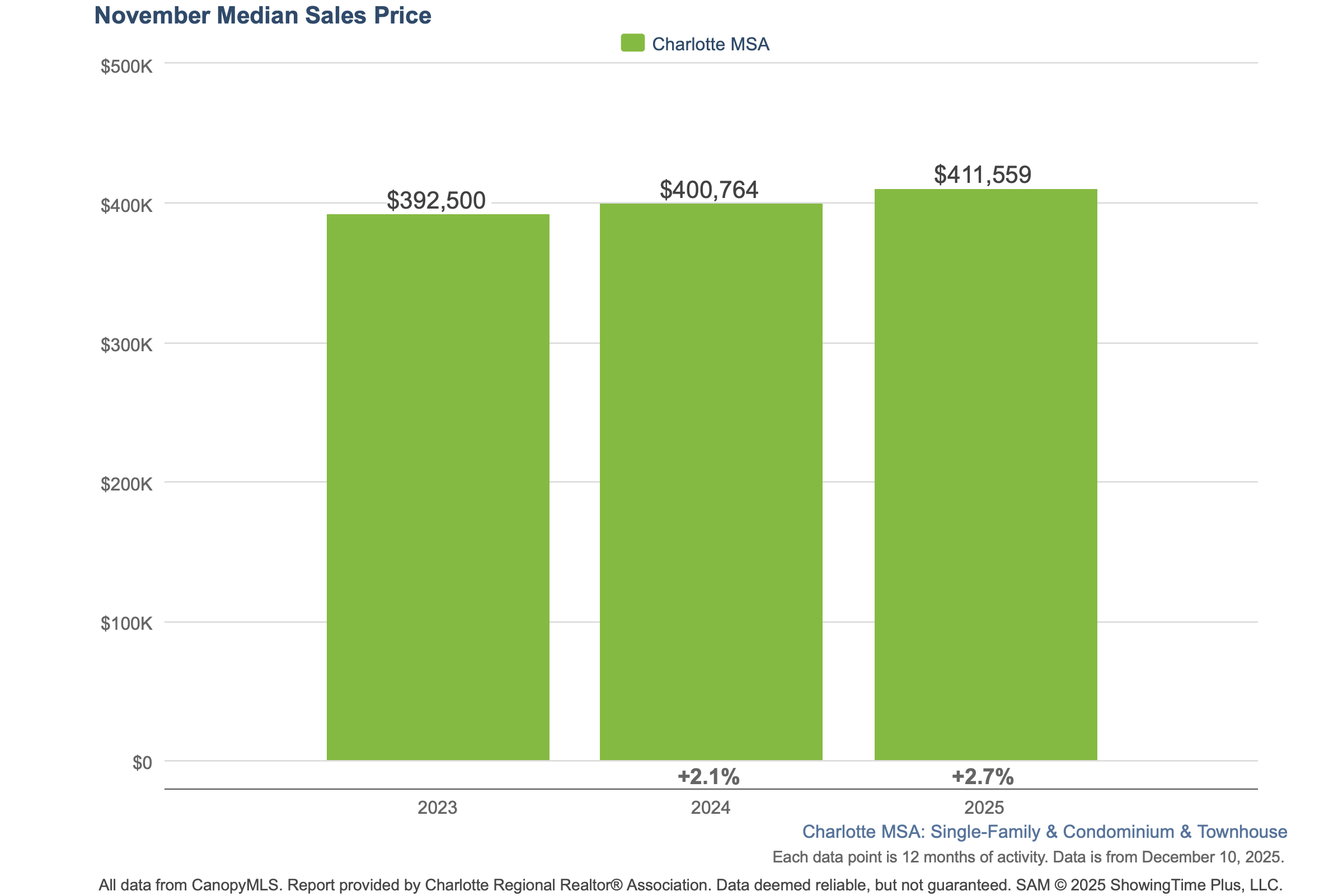 The median sales price in the Charlotte area reached $400,639 in November 2024, continuing a trend of steady growth from 2021, where prices started at $290,000. This reflects an approximate 38% increase over the last 3 years, driven by consistent demand and limited supply.
