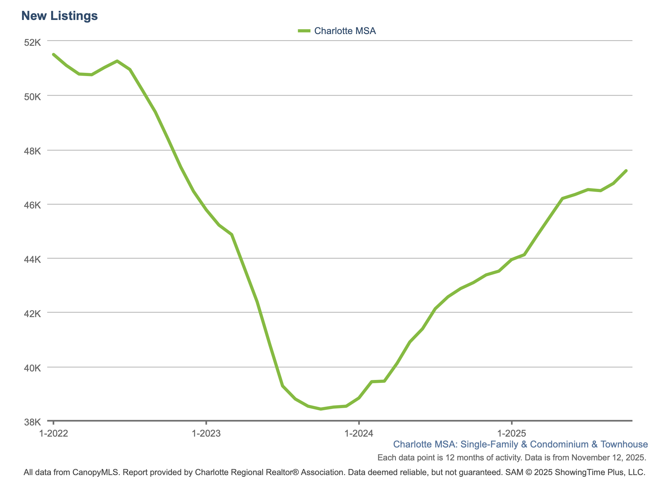 The Charlotte area housing market continued to show healthy momentum through October 2025, with new listings reaching 47,218 over the past 12 months—up from 43,093 a year earlier. This marks a notable gain in inventory, reflecting increased seller confidence and a more dynamic flow of homes entering the market. After a period of lower listing activity in 2023, the steady climb throughout 2024 and into 2025 highlights growing participation and renewed energy among homeowners looking to make a move.