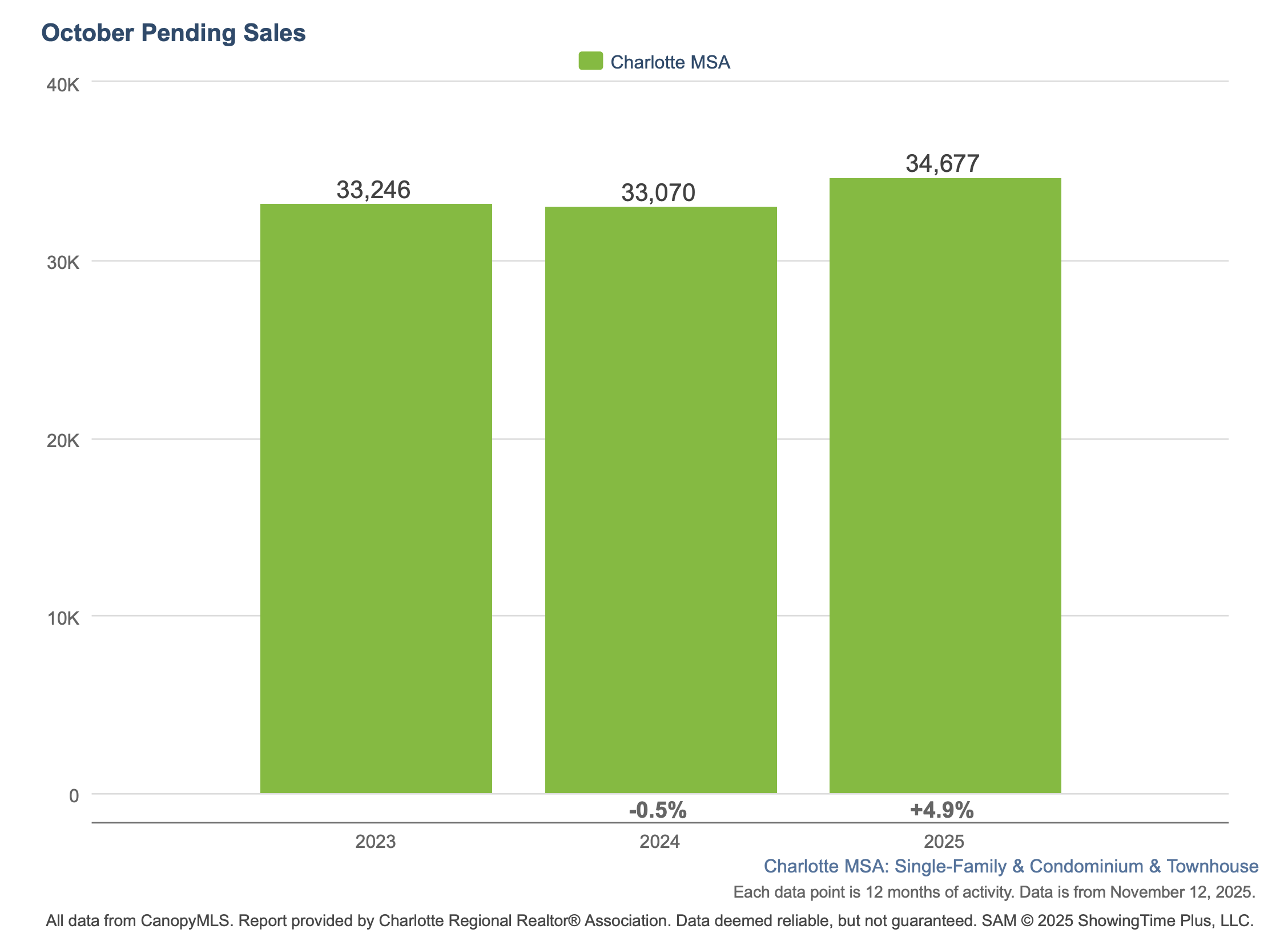 The gain in pending sales reflects improving buyer confidence, supported by a gradual stabilization in mortgage rates and growing housing inventory across the region. With more new listings entering the market and buyers showing a willingness to engage, the Charlotte area continues to demonstrate underlying market resilience. The increase in contract activity suggests that the local housing market is maintaining strong momentum heading into late 2025, setting the stage for a healthy close to the year.