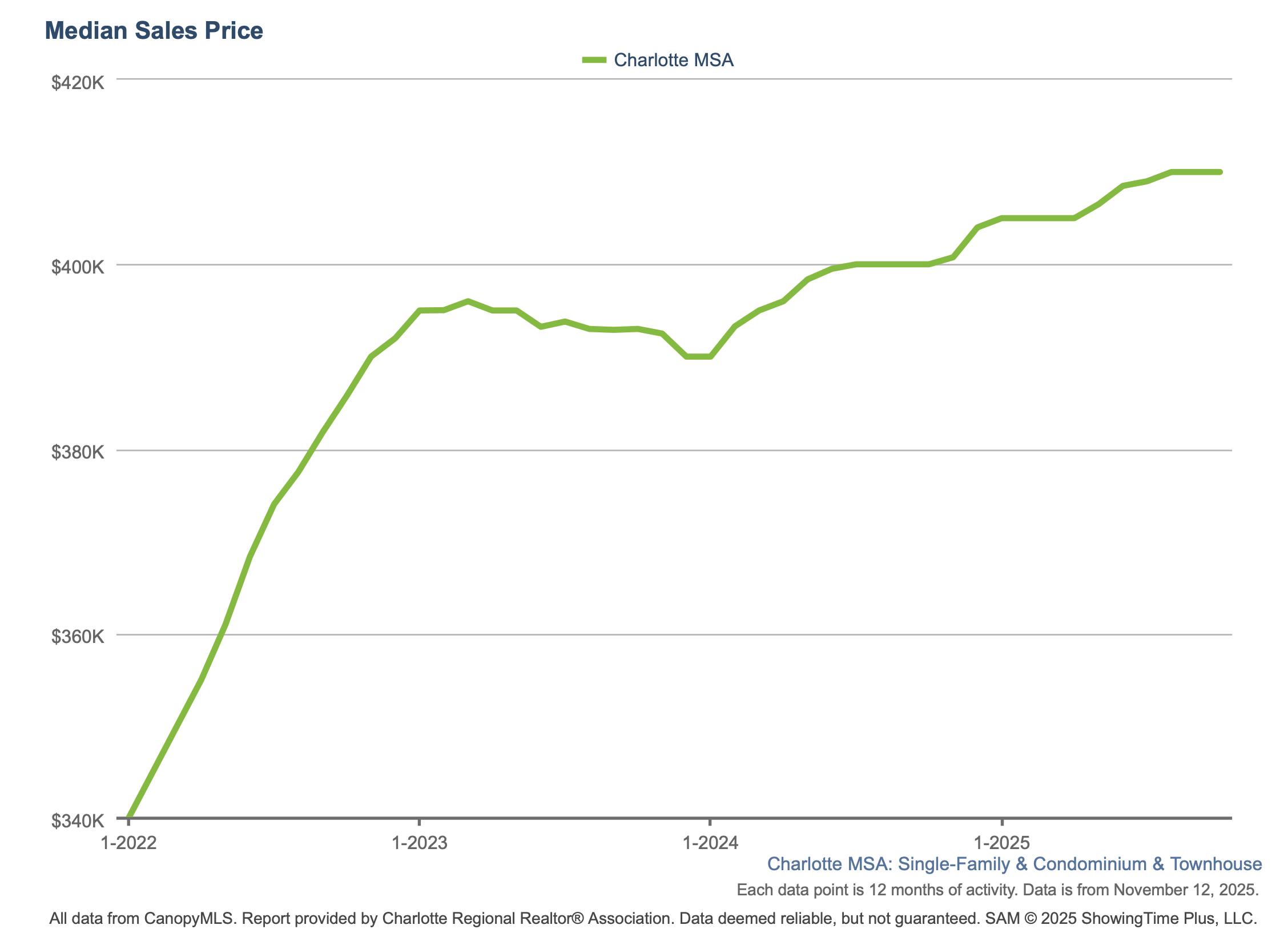 Home prices in the Charlotte area have continued to show remarkable steadiness and gradual growth, with the median sales price reaching $410,000 as of October 2025. This marks a 2.5% increase from $400,000 the year prior and reflects consistent upward momentum following a period of stabilization through 2023 and early 2024.