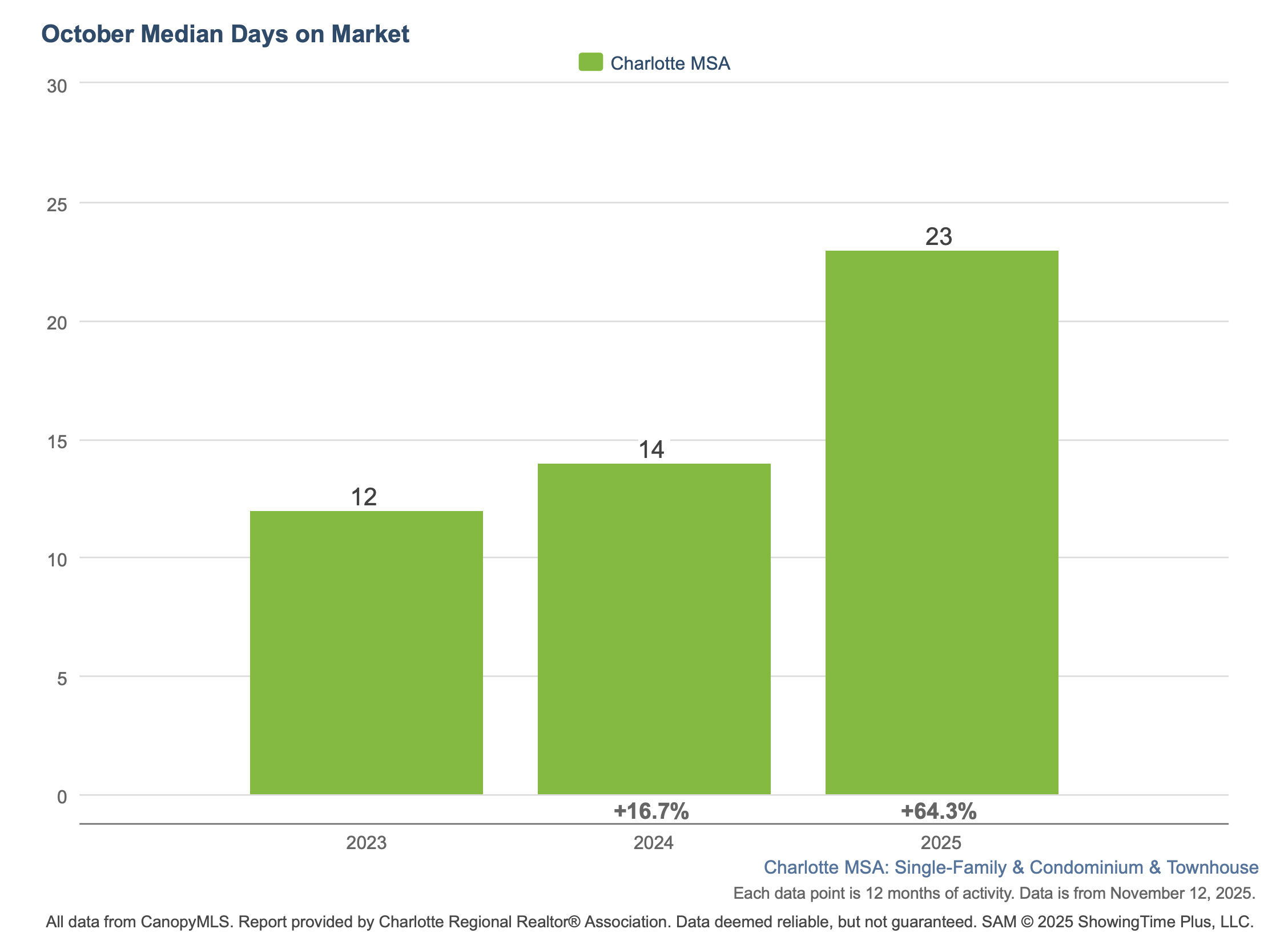 Homes in the Charlotte area are spending a bit more time on the market, with the median days on market rising from 14 in October 2024 to 23 in October 2025. While this shift signals a modest cooling compared to the rapid pace seen in recent years, it also points to a healthier, more balanced housing market—one that gives buyers additional time to make confident decisions and sellers a steadier environment for pricing and negotiation.